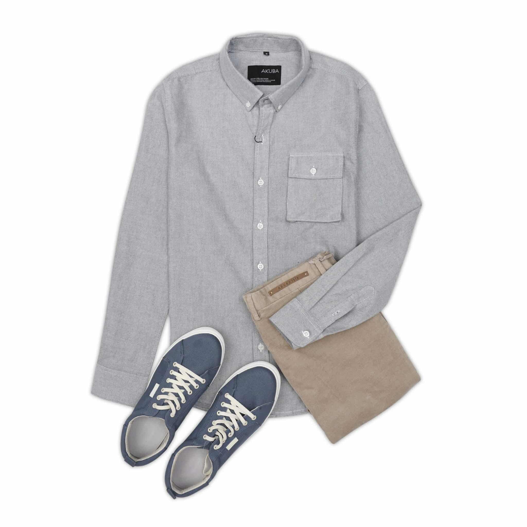 Áo sơ mi: Chất liệu cotton, kiểu dáng slim-fit, cổ bẻ cài khuy, một túi ngực có nắp, màu xám nhạt trang nhã.